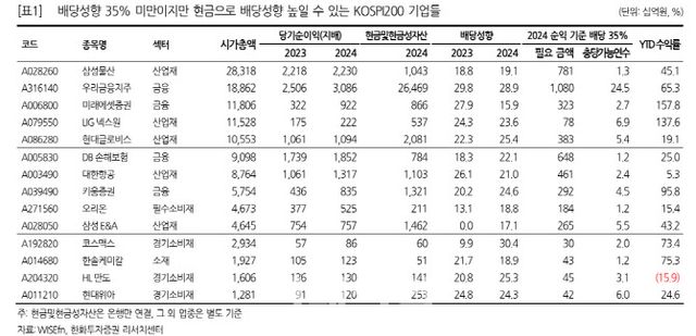 한화투자증권은 코스피200 내 최근 3년 배당성향이 35% 미만이면서, 2024년 순익 기준 배당성향 35%를 1년 이상 커버할 수 있는 현금을 보유한 종목들을 선별했다. 삼성물산(028260), 우리금융지주(316140), 미래에셋증권(006800), LIG넥스원(079550), 현대글로비스(086280), DB손해보험(005830), 대한항공(003490), 키움증권(039490), 오리온(271560), 삼성E&A(028050), 코스맥스(192820), 한솔케미칼(014680), HL만도(204320), 현대위아(011210) 등이 해당된다.
