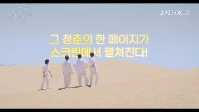 ‘6DAYS’는 음악과 낭만을 따라 달린 6일, DAY6의 시네마틱 여정을 담은 뮤직 로드무비다. 이번에 공개된 메인 예고편은 많은 이들의 인생 노래로 불리는 역주행 히트곡 ‘한 페이지가 될 수 있게’와 함께 무계획 여행을 떠난 DAY6 멤버들의 모습으로 시작한다.