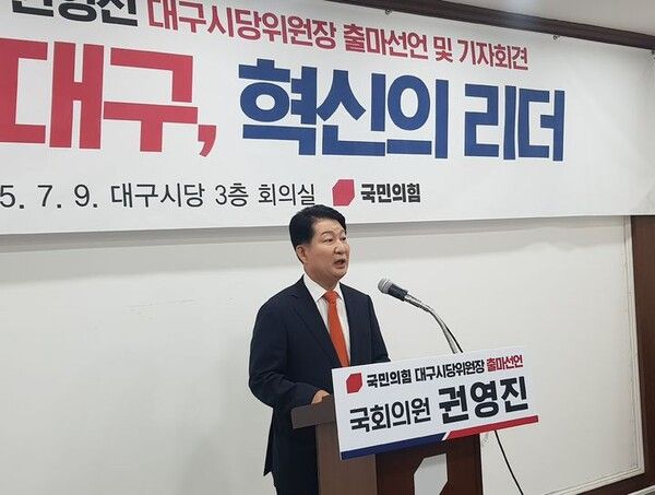 국민의힘 권영진(대구 달서병) 의원은 9일 오전 국민의힘 대구시당에서 기자회견을 열고 대구시당 위원장 선거에 출마한다고 밝혔다.