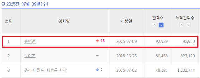 영화관입장권 통합전산망에 따르면 ‘슈퍼맨’은 지난 9일 92,939명의 관객을 모으며 전체 박스오피스 1위에 올랐다.