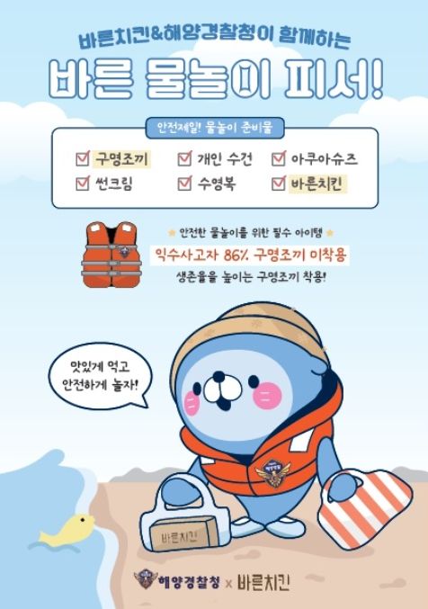 [파이낸셜경제=김영란 기자] 해양경찰청은 바른치킨과 함께 여름철을 맞아 구명조끼 착용 생활화를 통한 안전한 물놀이를 위한 협업하여 홍보한다고 10일 밝혔다.