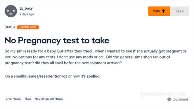▲ EA 포럼에 게시된 심즈 4 임신 버그 보고 (자료출처: EA 포럼 공식 페이지)
