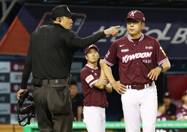홍원기 감독이 심판과 대화하고 있다. 기사의 이해를 돕기 위한 사진 / 연합뉴스