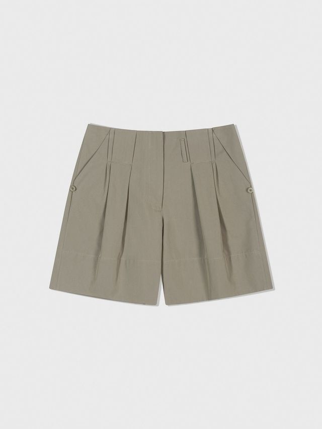 핀턱 포인트가 들어간 면 소재의 쇼츠. 사이드 버튼 디테일로 롤업 스타일로 연출 가능합니다.