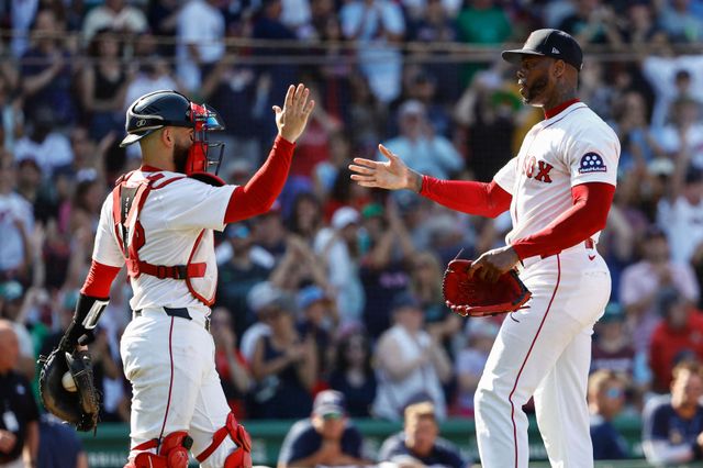 BOSTON, MA - JULY 13: Catcher Connor Wong #12 of the Boston Red Sox congratulates Aroldis Chapman #44 after their 4-1 win over the Tampa Bay Rays at Fenway Park on July 13, 2025 in Boston, Massachusetts. (Photo By Winslow Townson/Getty Images) (Photo by Winslow Townson / GETTY IMAGES NORTH AMERICA / Getty Images via AFP)/2025-07-14 05:50:16/