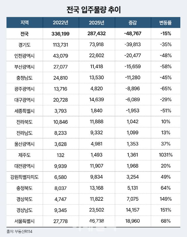 한 전문가는 “부동산 침체의 영향이 아직 이어지고 있다곤 하지만 아파트 매매량은 2022년 이후 전국 거의 모든 지역에서 빠르게 증가하고 있으며 이는 주택 수요층이 충분히 움직이고 있음을 의미한다”며 “이처럼 수요가 충분한데 새 아파트 입주는 올해부터 수년간 기록적으로 감소할 것으로 보여 당분간 새 아파트 품귀 현상이 강하게 나타날 수 있다”고 말했다.