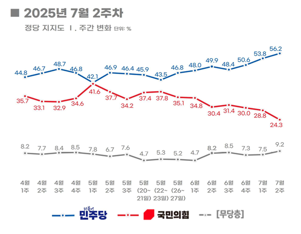 중도층은 민주당이 0.9%P 오르고 국민의힘은 2.4%P 내리면서 민주 56.8%·국힘 23.6%로 집계됐다.