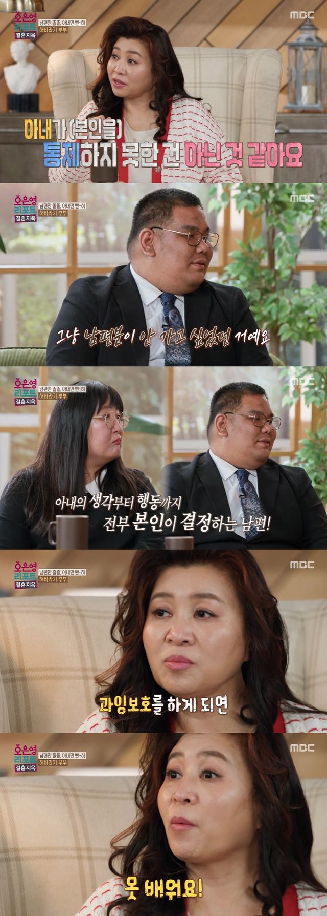14일 방송된 MBC '오은영 리포트 - 결혼 지옥'(결혼지옥)에서는 남편이 없으면 자기 관리 제로, 남편만 졸졸 따라다니는 아내와 이런 아내가 걱정인 남편, 해바라기 부부가 오은영 박사를 찾았다.