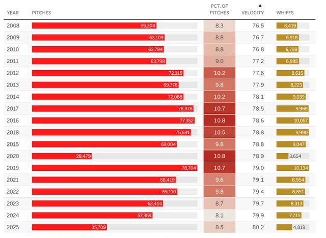 올 시즌 커브의 피안타율은 0.225로 패스트볼의 0.263보다는 낮지만 슬라이더/스위퍼/슬러브의 0.222와는 오히려 높았다. 그렇다보니 투수들은 제구가 어려운 커브 보다 더 쉽고 편하게 던질 수 있는 변화구로 빠르게 이동하고 있다.