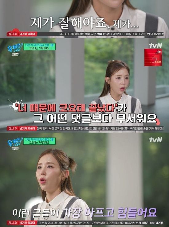 신지는 "저는 혹여라도 팀에 피해가 갈까 봐 일부러 다 보고 있다. 댓글들이나 반응들을. '너 때문에 코요태 끝났다' 이런 댓글이 그 어떤 댓글보다 무섭다. '너 때문에 코요태 망했다, 너 때문에 코요태 끝났다' 이런 글들이 가장 아프고 힘들다. 그 어떤 말보다"라며 고백했다.