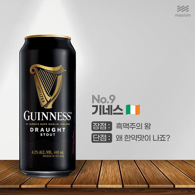 순위권에 오른 맥주들의 특징은 마시기에 가볍고, 청량하고, 황금빛의 투명한 맥주다. 이 녀석 빼고. 바로 세계 최고의 흑맥주 ‘기네스’다. 아일랜드의 대표적인 맥주이지만, 최근에는 틱톡 등의 소셜미디어를 타고 영국, 미국에서 MZ들이 마시는 스타일리시한 맥주로 자리 잡았다. 세계가 환호하는데 왜 한국에는 기네스붐이 아직 오지 않는가! 한약 아니라고! 컵에 따라 마셔야 한다고!