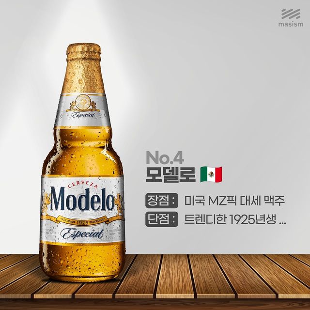 지난 몇 년간의 미국 맥주 시장의 떠오르는 루키다. 모델로는 멕시코의 자부심이라고 말해도 좋을 국민 맥주다. 그런데 미국에서 인기를 얻고 있다. 그냥 인기가 아니라 2023년에는 버드라이트를 제치고 미국에서 가장 잘 팔리는 맥주가 되었다. 특히 젊은 친구들에게 다른 맥주들은 조금 아빠나 삼촌이 마시는 것 같다나? 그런데 말이지. 이 모델로는 무려 1925년부터 나온 맥주다. 안티에이징 최고.