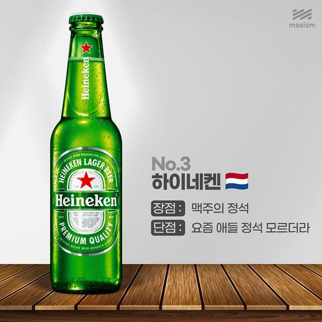 돌고 돌아 하이네켄. 네덜란드의 ‘하이네켄’은 3번째의 자리를 차지했다. 과거에는 다른 맥주회사들이 따라잡지 못하는 센스로 마케팅을 잘하는 느낌이었는데, 이제는 마케팅만으로 승부하는 맥주판에서 정석이란 무엇인가를 말하는 맥주가 되었다. 그게 하이네켄이 정말 깊어진 것인지, 요즘 맥주 콘셉트가 괴인이 돼서인지 모르겠지만.