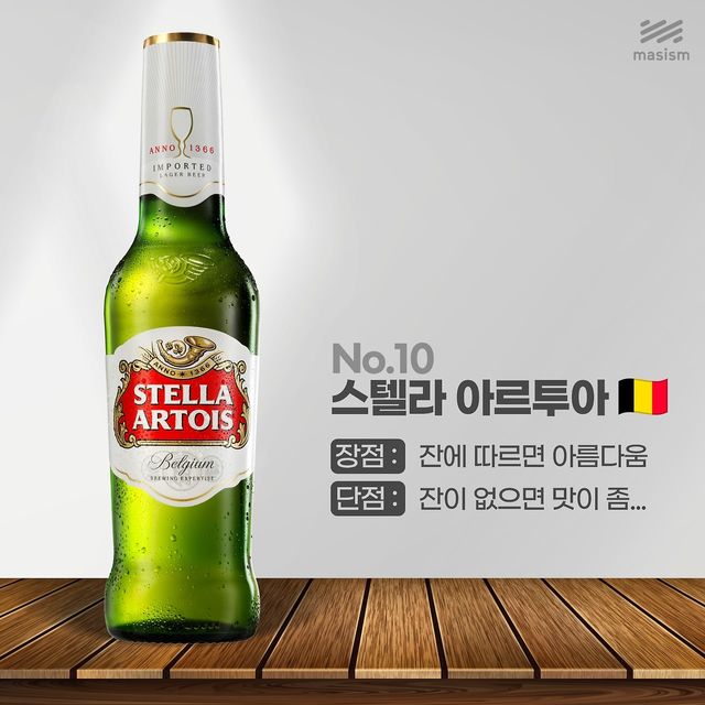 전용 잔이 가장 예쁜 맥주. 스텔라 아르투아가 마지막 순위를 차지했다. 맥주 잘 만들기로는 세 손가락 안에 들어가는 벨기에의 맥주로 맛 또한 대단하다. 원래는 크리스마스 특별판으로 낸 맥주였는데, 너무 많은 인기 때문에 상시판매는 물론 유럽, 아시아, 미국 등에서 인기 있는 맥주가 되었다. 하지만 아무리 이렇게 말해도 전용 잔이 없으면 뭔가 공허한 맛이 난다. 잔을 꼭 구비하도록 하자.