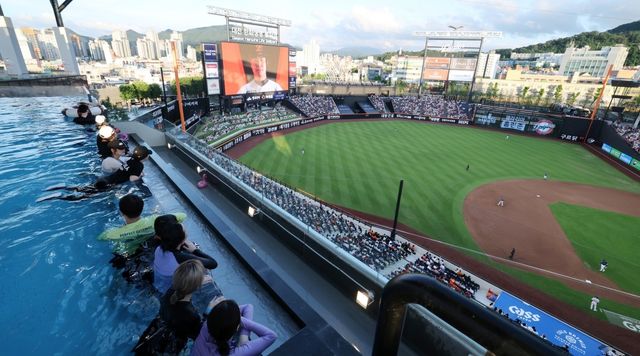 지난 1일 오후 대전한화생명 볼파크에서 열린 프로야구 '2025 신한 SOL뱅크 KBO 리그' 한화 이글스와 NC 다이노스 경기에서 관중들이 인피니티 풀에서 경기를 관람하고 있다. / 뉴스1