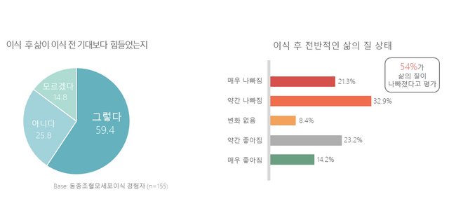 설문에 참여한 동종이식 경험자 155명 중 59%는 “이식 전보다 삶이 더 힘들어졌다”고 답했다. 이들 중 절반 이상인 54%는 삶의 질이 전반적으로 나빠졌다고 평가했다. 기대했던 회복의 여정이 오히려 또 다른 고통의 시작이 되었다는 응답이 주를 이뤘다.