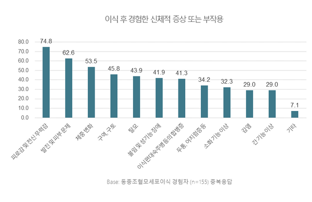 특히 신체적 후유증은 일상에 큰 영향을 미쳤다. 피로감 및 무력감(75%), 발진 및 피부문제(63%), 체중 변화(54%)가 대표적인 증상이었고, 이외에도 불임 및 성기능 장애(42%)와 같은 민감하고 사회적으로 중대한 영향을 주는 문제도 다수 보고됐다. 정신적 스트레스(우울, 불안 등)를 호소한 환자는 68%에 달했다.