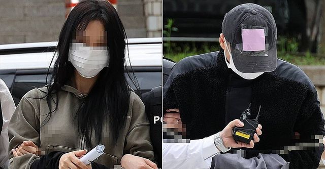 축구 국가대표팀 주장 손흥민의 아이를 임신했다고 주장하며 손씨에게 돈을 뜯어내려 한 20대 여성 양모씨(왼쪽)와 40대 남성 용모씨가 지난 5월 17일 영장실질심사를 받기 위해 서울중앙지법에 들어서고 있다 / 연합뉴스