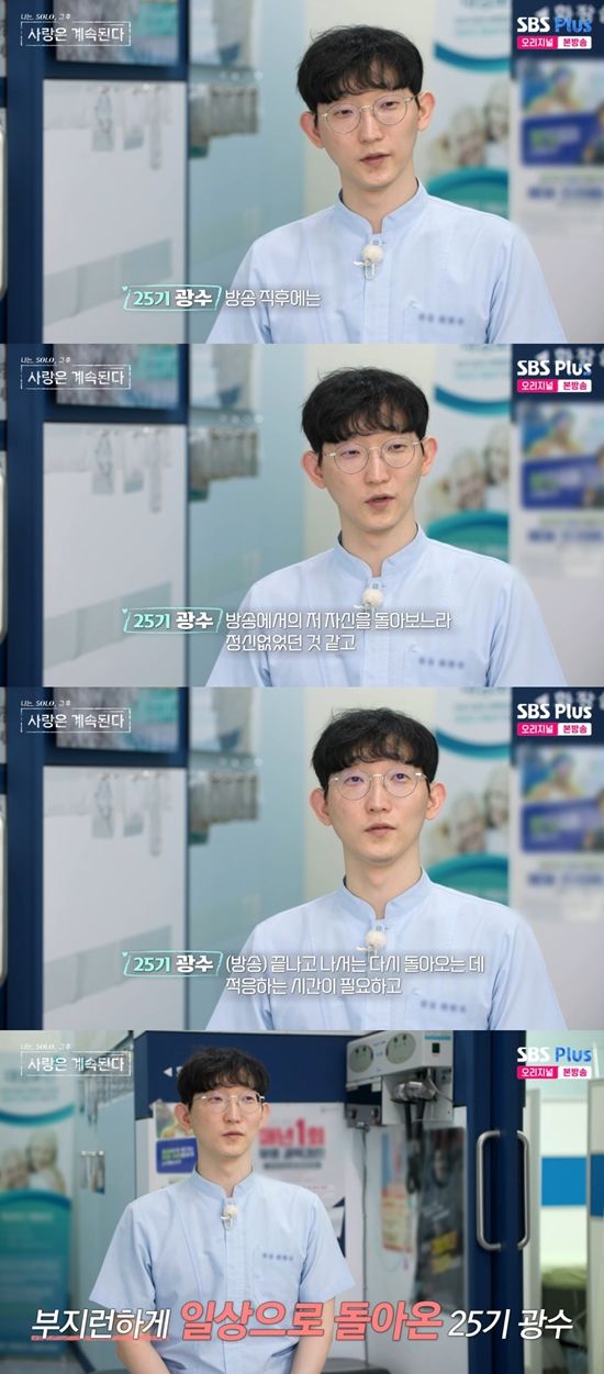 25기 광수는 "방송 직후에는 방송에서의 저 자신을 돌아보느라 정신이 없었던 것 같고, 끝나고 나서는 다시 돌아오는데 적응하는 시간이 필요했다"라며 근황을 밝혔다. 이에 데프콘은 "연애를 안 하신 것 같다"라고 말했다.