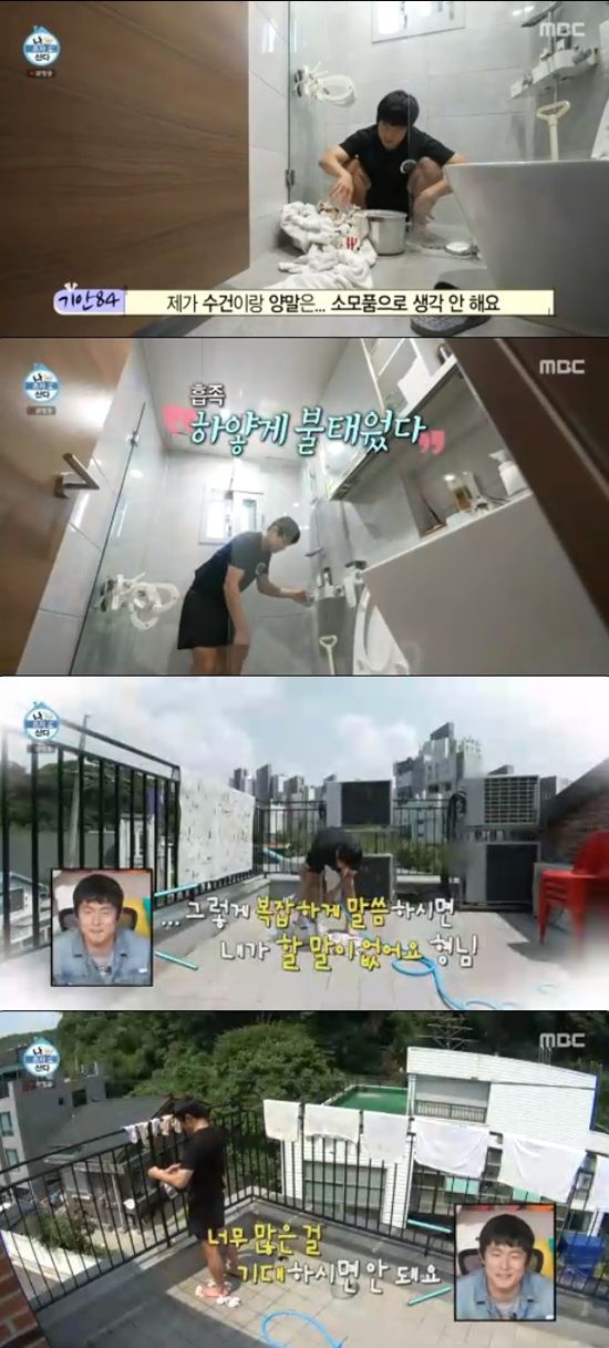 기안84는 하얘진 수건과 양말을 가지고 옥상 테라스로 올라가 바닥에 내동댕이쳤다. 기안84는 수건과 양말에서 나오는 락스 물을 이용해 바닥 청소를 하려고 했다.