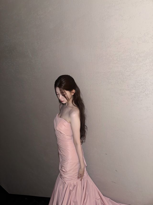 빌리 츠키는 핑크 톤의 드레스를 선택해 사랑스러운 매력을 극대화했다. 오프숄더 라인이 어깨선을 드러내며 여리여리한 실루엣을 강조했고, 긴 웨이브 헤어가 한층 로맨틱한 분위기를 만들었다.