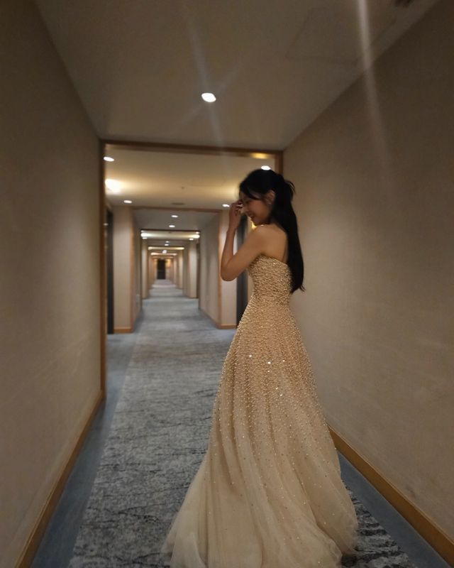 박보영은 골드 톤의 튤 드레스를 선택해 빛나는 존재감을 자랑했다. 빼곡히 채워진 골드 비즈 디테일이 화려함의 극치를 보여주며, 슬림한 실루엣이 여성스러운 라인을 강조했다. 자연스럽게 풀어내린 긴 머리가 부드러운 분위기를 더했다.