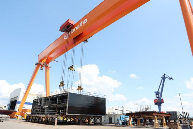 한화필리십야드 골리앗크레인이 대형 블록을 이동시키기 위해 준비중이다. (사진=한화오션)