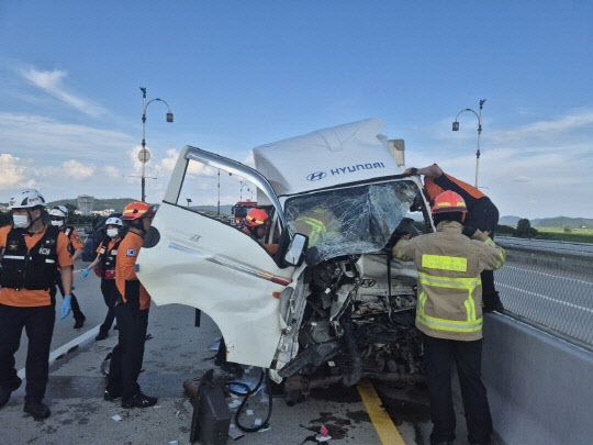 부여소방서에 따르면 이날 오후 4시 53분경 부여대교 논산→홍산 방향에서 1.5톤 트럭과 화물차가 충돌했다.