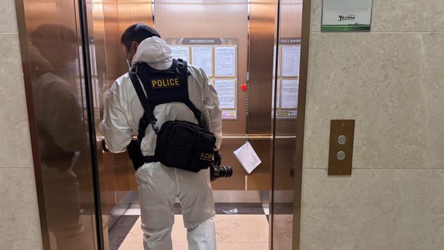 21일 총기 사고가 발생한 인천 연수구 한 아파트 단지에 수사관이 엘리베이터를 타고 들어가고 있다. / 뉴스1