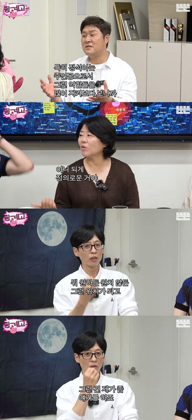 이정은은 "되게 정의로운 거다"라고 칭찬했고 유재석 또한 "전체를 위해서는 그렇게 이해를 해줘야 한다. 저도 어딜 가나 제가 원하든 원치 않든 그런 위치가 되고 상황이 되니 제가 좀 이야기를 한다. 그래서 제작진이 안 좋아한다"고 진지하게 이야기하다 농담을 덧붙여 웃음을 안겼다.