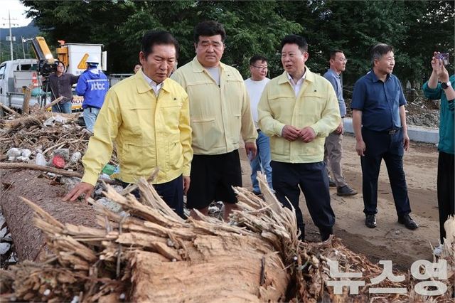 서태원 군수(오른쪽)와 정청래 국회 법제사법위원장(왼쪽)이 피해 상황을 둘러보고 있다./사진=가평군