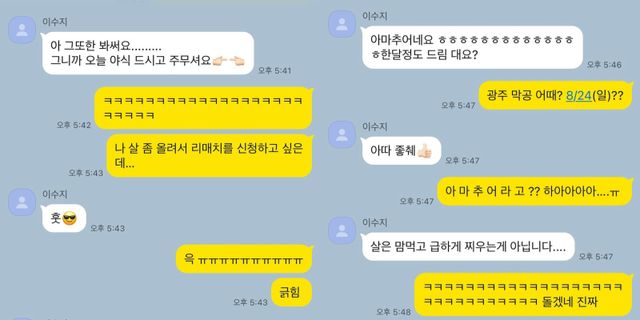 싸이가 21일 자신의 소셜미디어(SNS)에 “러브버그쇼 리매치 확정. 광주 막공”이란 글과 함께 이수지와 나눈 대화 내용을 공개했다.
