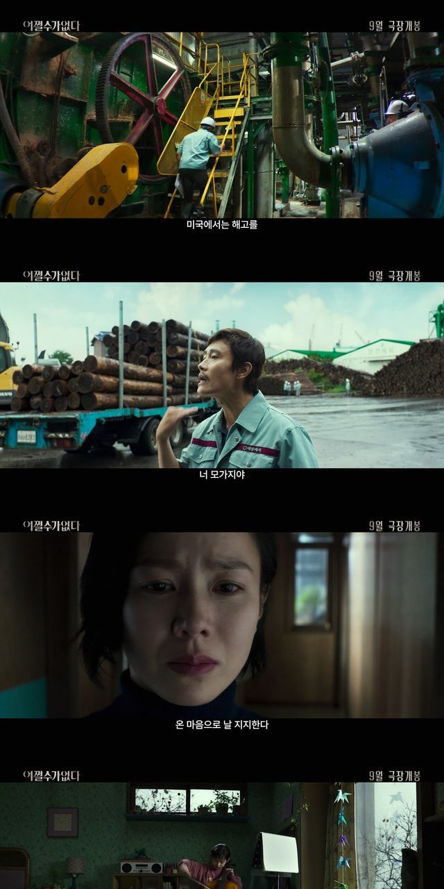함께 공개된 티저 예고편은 “미국에선 해고를 ‘도끼질 한다’고 한다면서요. 한국에선 뭐라고 그러는지 아세요? 너 모가지야.” 라는 ‘만수’의 대사와 함께 시작되는 강렬한 비트의 음악으로 눈과 귀를 사로잡는다. 그리고 등장하는 다양한 캐릭터들의 변화무쌍한 모습은 예고편에서 한시도 시선을 뗄 수 없게 만든다. 재취업을 향한 전쟁을 시작한 ‘만수’와 어떤 위기에도 흔들림 없는 ‘미리’ 부부를 중심으로, 잘나가는 제지 회사 반장 ‘선출’, 재취업이 절실한 업계 베테랑 ‘범모’, 풍부한 감성의 예술가 ‘아라’, 업계에서 잔뼈가 굵은 실력자 ‘시조’까지. ‘어쩔수가없다’ 속 인물들의 모습이 짧지만 강렬하게 이어지는 티저 예고편은 과연 그들 사이에 어떤 일이 펼쳐질지 강한 호기심을 불러일으킨다. 이병헌과 손예진의 첫 부부 호흡을 비롯해 박희순, 이성민, 염혜란, 차승원의 새로운 얼굴과 폭발적인 시너지를 엿볼 수 있는 티저 예고편은 ‘어쩔수가없다’에 대한 기대를 한층 끌어올린다.