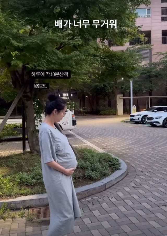 영상 속에는 만삭 같은 쌍둥이 배를 안고 힘겹게 산책 중인 김지혜의 모습이 담겨 있다. 임신 7개월에 접어들며 확연하게 눈에 띄는 D라인이 이목을 끈다.