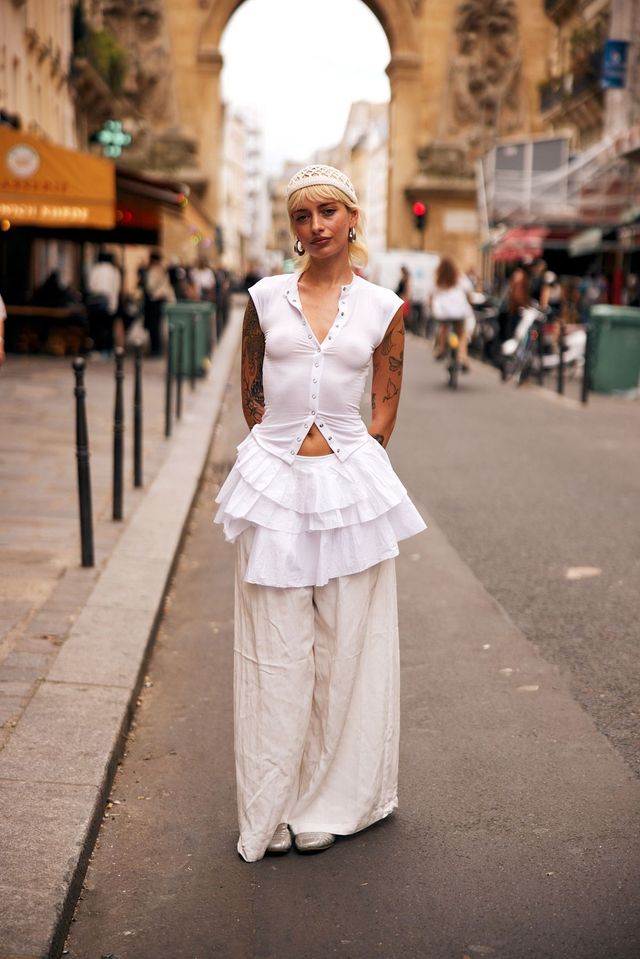 화이트가 단정하기만 하다는 건 편견입니다. 허리가 살짝 드러나는 버튼 티셔츠에 러플 디테일이 돋보이는 화이트 미니스커트와 시스루 와이드 팬츠를 매치하니 전체적인 룩이 한결 풍성해졌죠. 언뜻 봤을 땐 페미닌한 요소가 가득하지만, 룩이 전혀 유치하지 않고 오히려 감각적인 이유는 과감한 실루엣 덕분이죠. 화이트 룩을 유니크하게 연출하고 싶다면 허리 컷아웃, 언밸런스한 러플, 시스루처럼 톡톡 튀는 소재를 활용해보세요.