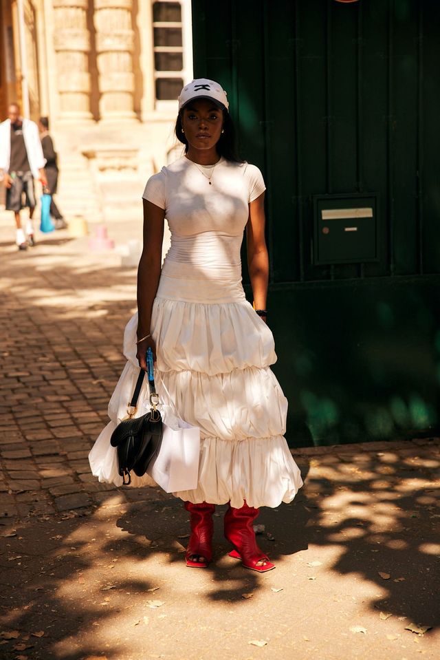 화려한 러플 드레스는 자칫 과해 보일 위험이 있습니다. 하지만 볼캡과 컬러 부츠, 구조적인 백 등으로 충분히 밸런스를 맞출 수 있죠. 특히 강렬한 레드 컬러의 부츠는 룩 전체에 생기를 불어넣습니다. 화이트 룩이지만 결코 심심하지 않게, 오히려 더욱 강렬하게 표현한 센스가 돋보이는군요.