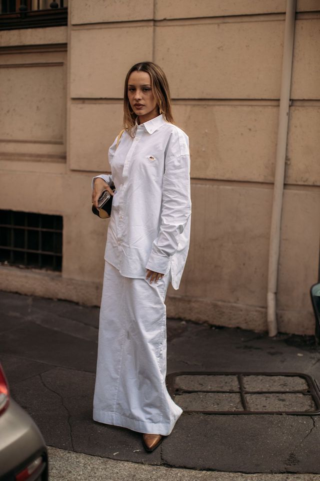 화이트 컬러라고 해서 반드시 산뜻해야만 할 필요는 없죠. 셔츠와 롱스커트를 셋업처럼 매치하면 묵직하고 단단한 인상을 줄 수 있습니다. 특히 셔츠의 박시한 실루엣에 구조적인 스커트를 더하면 힘 있는 분위기를 연출할 수 있죠. 여기에 앞코가 뾰족한 슈즈와 미니 클러치를 더해 세련미를 한껏 끌어올릴 수도 있고요.