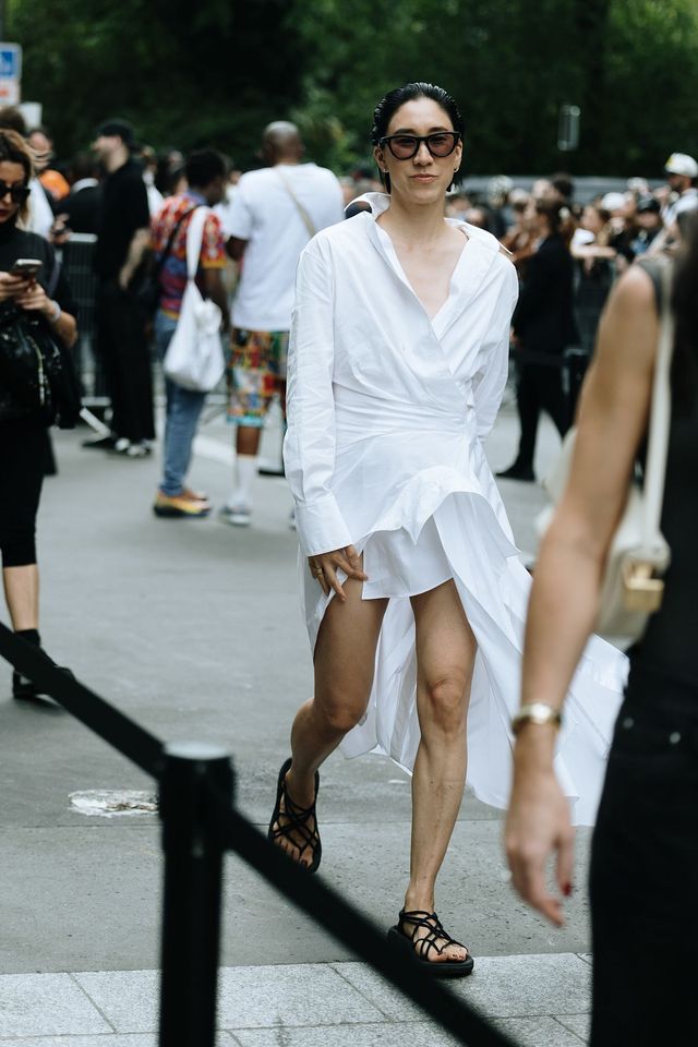 우아한 드레이핑이 돋보이는 셔츠 드레스만큼 화이트 컬러와 잘 어울리는 아이템도 없을 테죠. 깊은 트임과 언밸런스한 기장이 돋보이는 셔츠 드레스에 스니커 스타일 샌들과 선글라스를 더해 더없이 쿨한 화이트 룩을 완성했군요. 포멀과캐주얼의 경계를 자유롭게 오가는 연출이 돋보입니다. 이때 신발은 클래식보단 스포티한 아이템으로 선택하면 균형을 맞출 수 있죠.