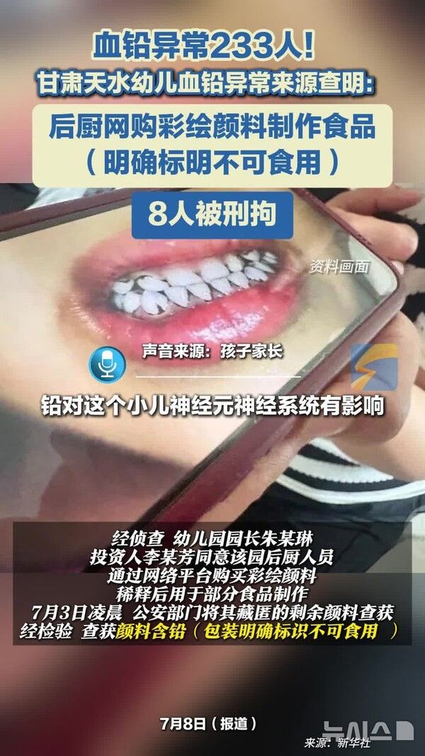 앞서 이달 초 중국 서북부 간쑤성의 한 유치원에서는 비(非)식용 물감을 급식에 넣어 200명이 넘는 아동이 납에 중독되는 일이 발생하면서 중국 내에서 큰 충격을 불러일으킨 바 있다.