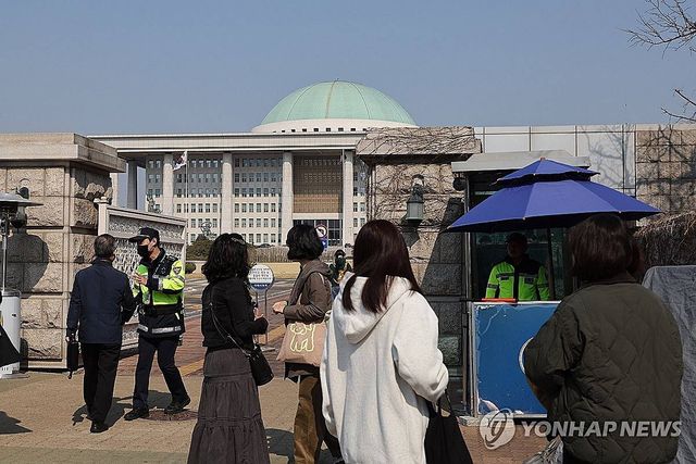 경찰에 따르면 A 씨는 오토바이를 타고 국회로 향했으며, 그가 들고 있던 비닐봉지 안에는 공포탄 300~400개가 들어 있었다. 사제 탄알은 아닌 것으로 파악됐다. 또 5만 원권 현금 수백 장도 함께 발견된 것으로 전해졌다. 사진은 서울 여의도 국회 앞, 기사와 무관 / 연합뉴스
