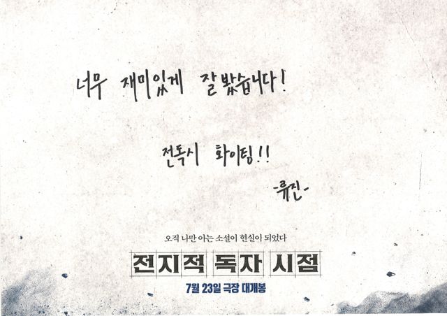 23일 배급사 롯데엔터테인먼트는 ‘전지적 독자 시점’을 향한 대한민국 대표 감독과 셀러브리티들의 친필 감상평을 공개했다. 동명 웹소설이 원작인 이 작품은 10년 이상 연재된 소설이 완결된 날 소설 속 세계가 현실이 되어 버리고, 유일한 독자였던 ‘김독자’가 소설의 주인공 ‘유중혁’ 그리고 동료들과 함께 멸망한 세계에서 살아남기 위한 판타지 액션 영화다.