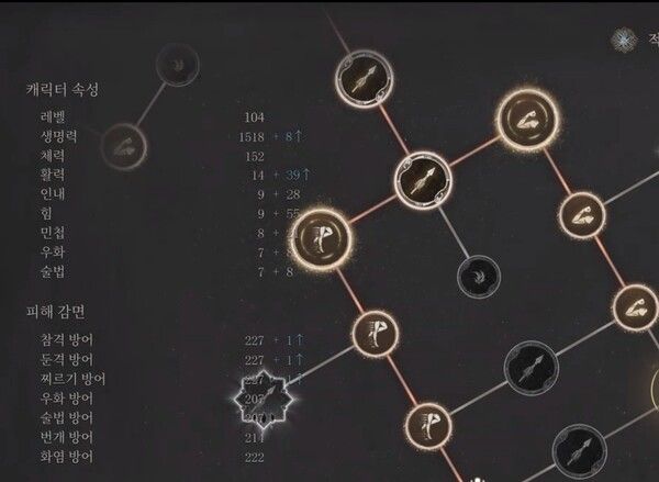 ▲활력퍽을 1개 찍었는데 방어 속성과 저항력이 오른다. 피해 감면 수치를 주의해서 올려야 한다. 따지고 보면 필요스탯 1을 올려주는 것 보다 불필요스탯5를 올려주는 퍽이 효율이 더 높다. 물리 전사로 육성한다고 할지라도 힘+1 퍽보다 주술+5 퍽이 훨씬 효율이 높다