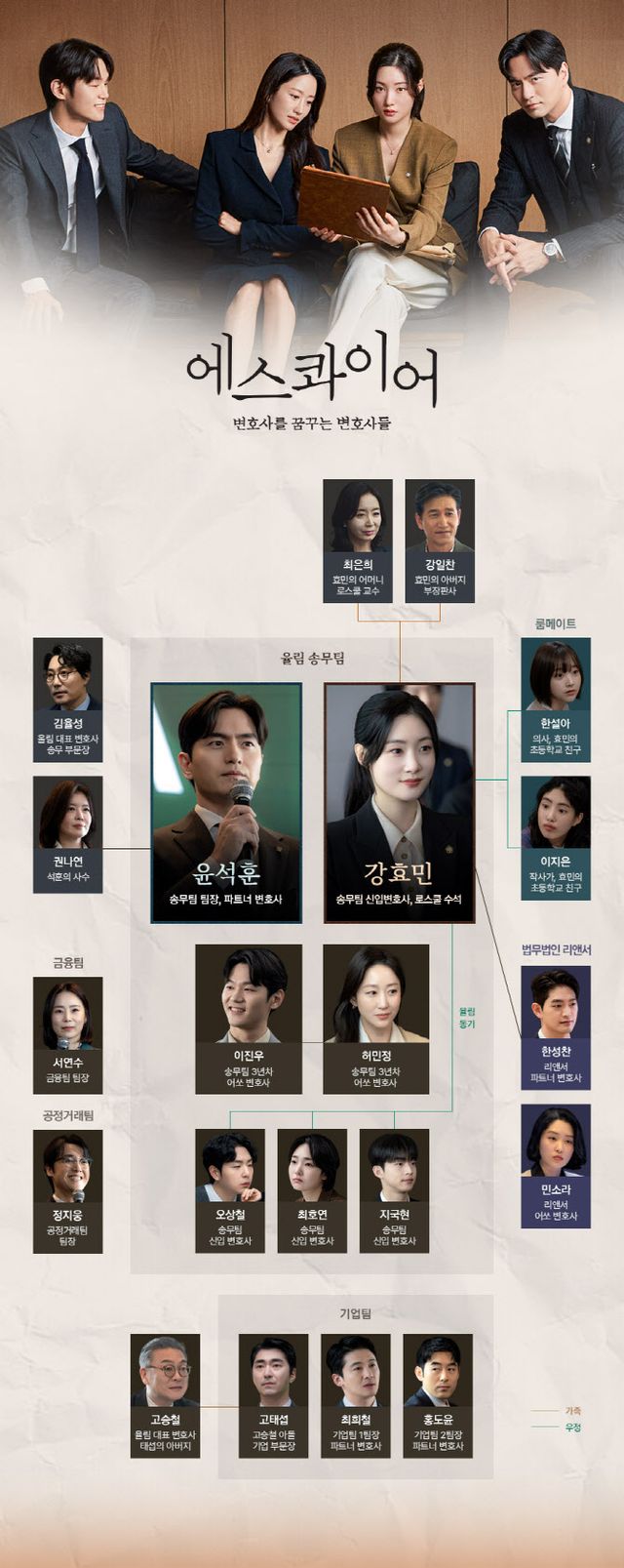 송무팀이라는 이름 아래 뭉칠 윤석훈, 강효민, 이진우(이학주 분), 허민정(전혜빈 분)이 보여줄 팀플레이에 관심이 쏠리는 가운데 이들이 출근할 법무법인 율림의 구성원을 한눈에 파악할 수 있는 인물관계도가 베일을 벗으며 호기심을 더욱 끌어올리고 있다.