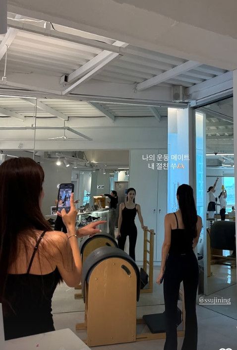 김성은은 자신의 개인 계정을 통해 "나의 운동 메이트 내 절친 쑤"라는 글과 함께 한 장의 사진을 게재, 필라테스 스튜디오에서 운동을 하고 있는 박수진의 모습이 담겼다. 이를 절친 김성은이 촬영해주고 있는 모습.