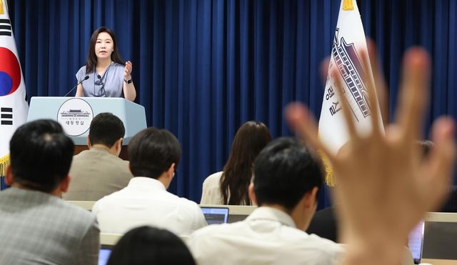 강유정 대통령실 대변인이 서울 용산 대통령실 청사에서 출입기자단에 브리핑을 하고 있다. / 뉴스1
