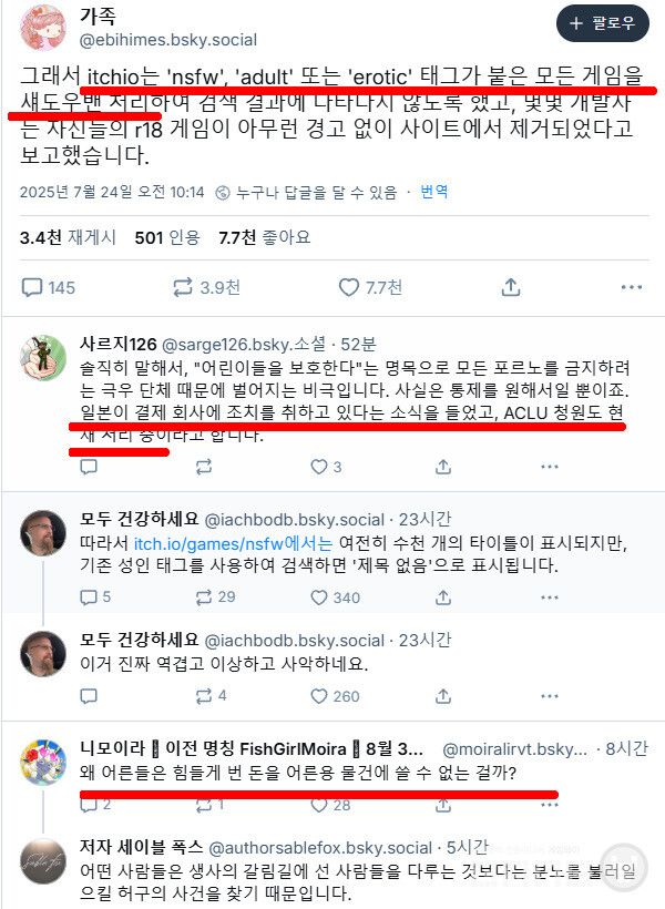 사태의 심각성은 블루스카이(BluesSky)에 올라온 한 개발자의 절망적인 게시물에서 시작됐다. 비주얼 노벨과 BL 게임 시나리오로 유명한 ebi-hime은 "NSFW, adult, erotic 태그가 붙은 게임들이 검색에서 완전히 사라졌고, 여러 개발자들의 R18 게임이 아무런 경고 없이 플랫폼에서 삭제됐다"고 폭로했다.