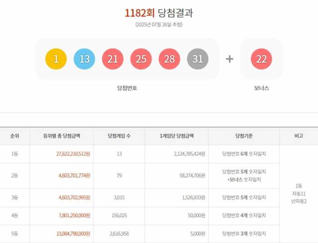 로또복권 운영사 동행복권은 제1182회 로또복권 추첨에서 ‘1, 13, 21, 25, 28, 31’이 1등 당첨번호로 뽑혔다고 26일 밝혔다.