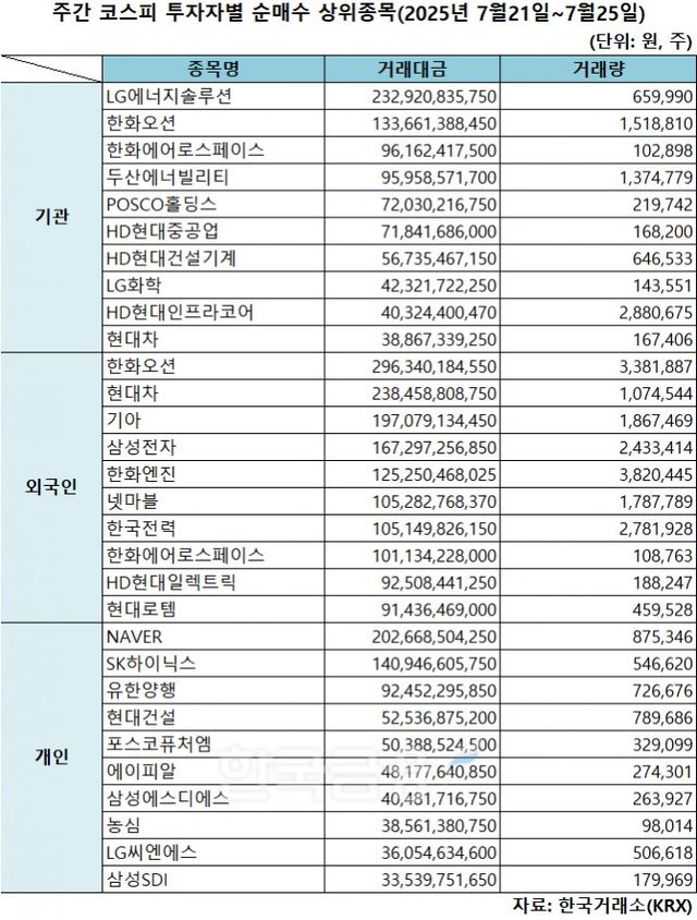 기관 'LG에너지솔루션'·외인 '한화오션'·개인 'NAVER' 1위 [주간 코스피 순매수- 2025년 7월21일~7월25일]