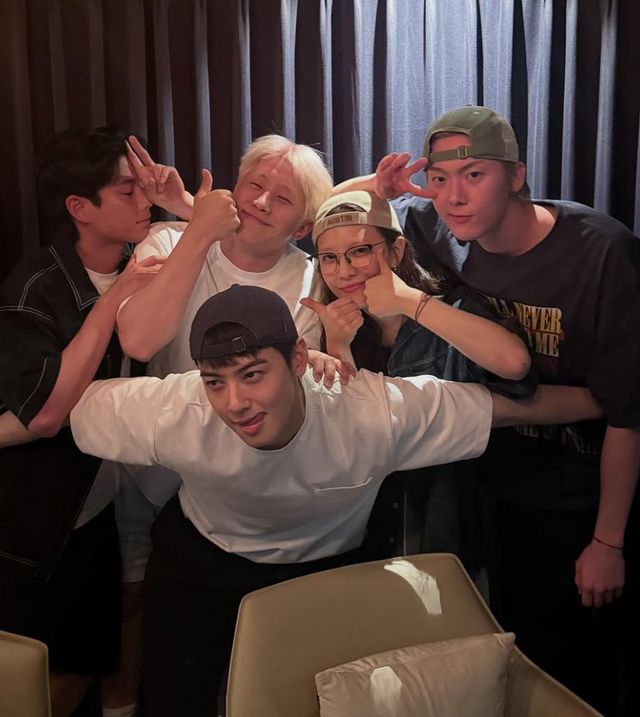 차은우는 아스트로 멤버들과 함께한 단체 사진도 공개했다. 멤버 故 문빈의 친동생 빌리 문수아도 함께해 뭉클함을 자아냈다.