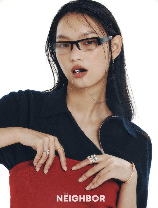 캐시미어 집업 톱과 코튼 튜브톱, 아이웨어 모두 Miu Miu.